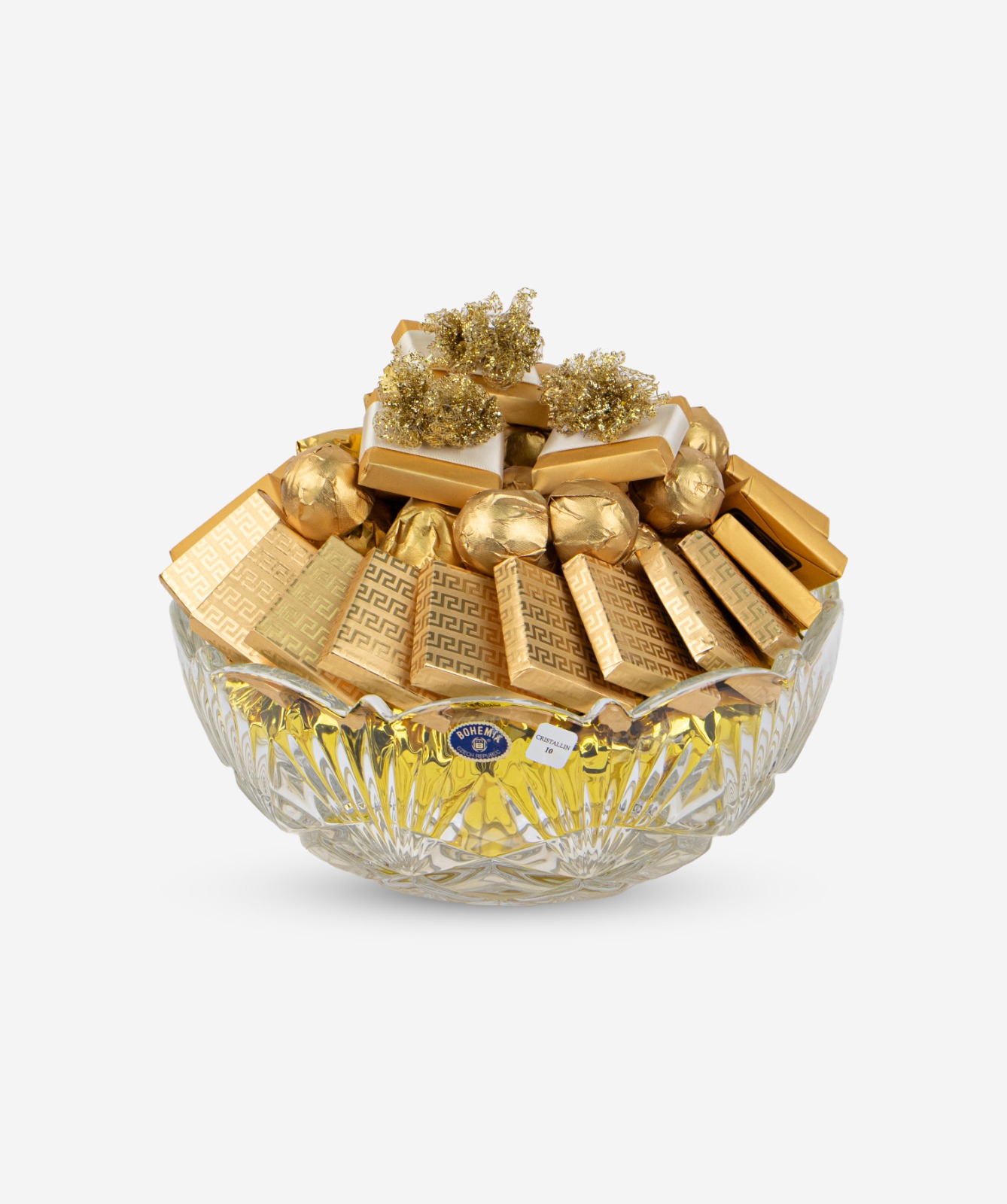 A fine glass gift containing 2300g of chocolates (croquants – gianduja – pralines – nuts) and 5 decorated pieces.